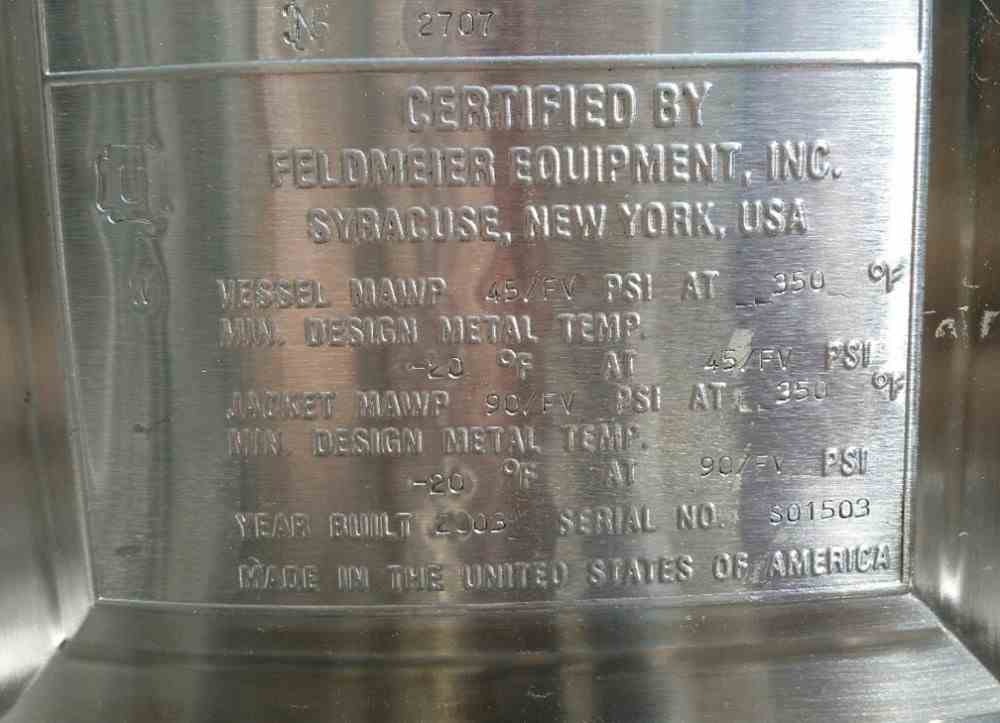 Used 60 Gallon Reactor Body, Sanitary Stainless Steel 60 gal. Feldmeier Vertical Jacketed Reactor Body, 22" dia x 36" straight side, Sanitary Stainless Steel construction with polished internal finish, rated 45 PSI/ Full Vacuum @ - 20 to 350 F internal, Jacket rated 90PSI/ Full Vacuum @ -20 F to 350 F, quick opening dished top head, dished bottom, center bottom outlet, with valve, stainless steel legs on casters, ASME & NB Code Stamped, Built 2003. Previous use: OTC Pediatric cough syrup.