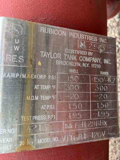 Used 416 Sq Ft 316L Stainless Steel Vertical Shell and Tube Heat Exchanger. Manufactured by Taylor Tank. Shell Rated 150 PSI@300F. (212) .75" OD Tubes rated 150PSI/FV@300F. 16" OD x 156.25" OAL. Serial #4213. Built 2016.
