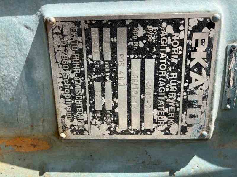 Used 1500 gallon 316 Stainless Steel reactor. Manufactured by Alloy Fab. Internal rated 90PSI/FV @390F. Jacket rated 90PSI @390F. 20 HP Ekato Agitator, EM 100D type, designed for 1300 kg/m3. Dished heads. Lug mounted. 316L stainless steel 3" half pipe coil jacket on shell o.d. and bottom head. National Board #1758. Serial #2890. Built 1986. Previously used in API facility.