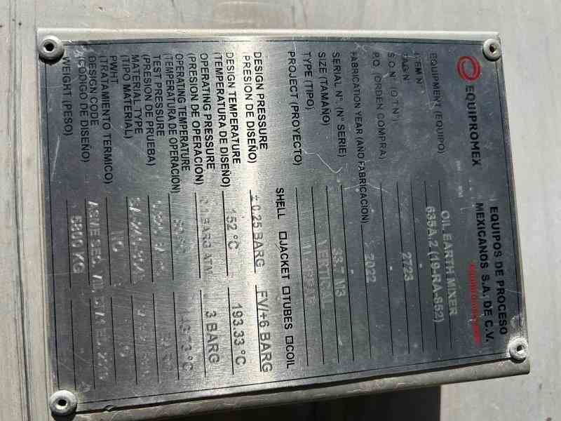 Unused 8,901 gallon 304L Stainless steel vertical pressure vessel. Manufactured by Equipromex (Mexico). Internal rated ATM @306F. External 316 SS Coil rated 87PSI/FV @380F. 10'0"ID x 12'0"T/T. Agitator: Mfg. by Chemineer Model #12MRA-3, 3 hp, 1800 rpm input, 45 rpm output, 230/460 volts. Dished head and bottom. Leg mounted. 12,786 lbs weight. Built 2022. Designed as Oil-Earth Reactor.