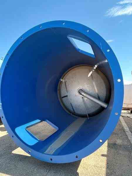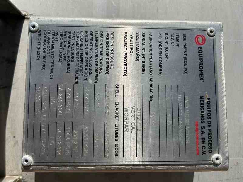Unused 28,216 gallon 304L Stainless steel vertical pressure vessel. Manufactured by Equipromex (Mexico). Internal rated Atm@248F. 304 SS Coil rated 87PSI/FV @380F. 11'6"ID x 32'10"T/T. Agitator: Mfg. by Chemineer Model #23GTL-7.5, 7.5 hp, 1800 rpm input, 16.5 rpm output, 230/460 volts. (5) 24" manways with davits. Dished head and bottom. Skirt mounted. 36,288 lbs weight. Built 2022. Designed as Enzyme Reactor.