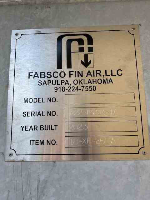 Unused 316L Stainless Steel 51859 sq ft finfan heat exchanger. Manufactured by Fabsco. Code Stamped. 2469 bare sq. ft. 30.54 MMBTU/hr design duty. 25'0" tube length. Both tubes and header are 316L SS. 75psi/FV design pressure @300F design temperature. (2) 25 hp fans. 390-1"od x .065"mw. Under Nitrogen Purge. Dimensions: 30'11" l x 14'8" w x 10'7" h (with Platforms), 14'4" w (w/o platforms), 41,458 lbs weight. Designed as Amine Regen Overhead Condenser. Built 2024. Under nitrogen purge.