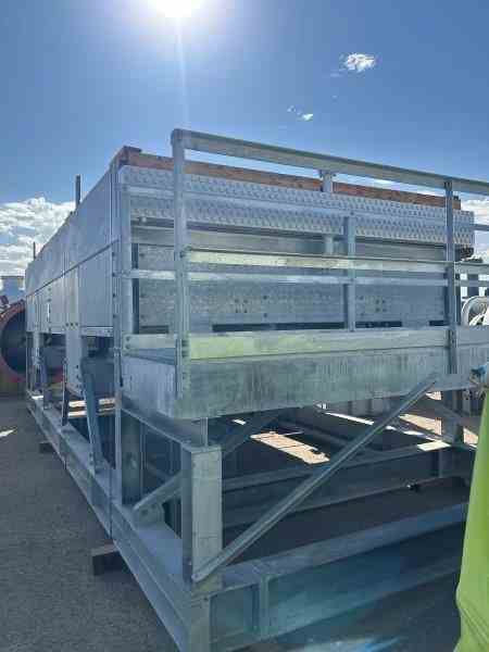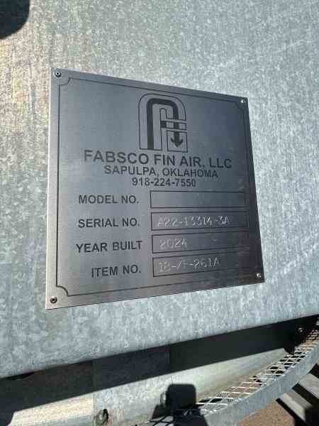 Unused Carbon Steel 48027 sq ft (2287 bare sq ft) finfan heat exchanger. Manufactured by Fabco. Rated 35psi/FV@ 300F, 41.1 MMBTU/hr design duty. 26'0" tube length. (2) 25 hp fans. 336-1"od x .083"mw. (2) 4" inlets and (2)4" outlets. Dimensions: 31'0" l x 12'4" w x 10'3" h (with Platform), 40,000 lbs weight. Designed as Lean Amine Coolers. Under Nitrogen Purge. Built 2024.