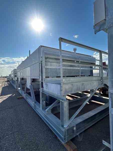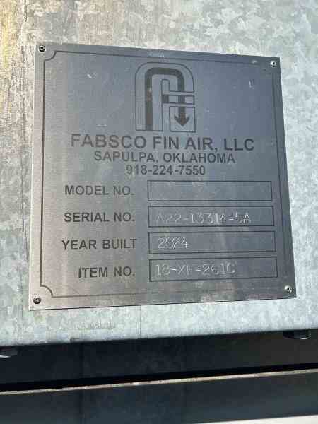 Unused Carbon Steel 48027 sq ft fin fan heat exchanger. Manufactured by Fabsco. 41.1 MMBTU/hr design duty. 2287 bare sq.ft. 26'0" tube length. Rated 135psi/FV @300F. (2) 25 hp fans. 336-1"od x .083"mw. (2)4" inlets and (2) 4" outlets. Dimensions: 31'0" l x 12'4" w x 10'3" h (with Platform), 40,000 lbs weight. Designed as Lean Amine Coolers. Under Nitrogen Purge. Built 2024.
