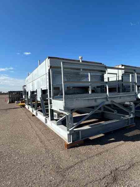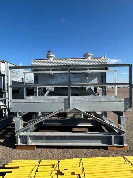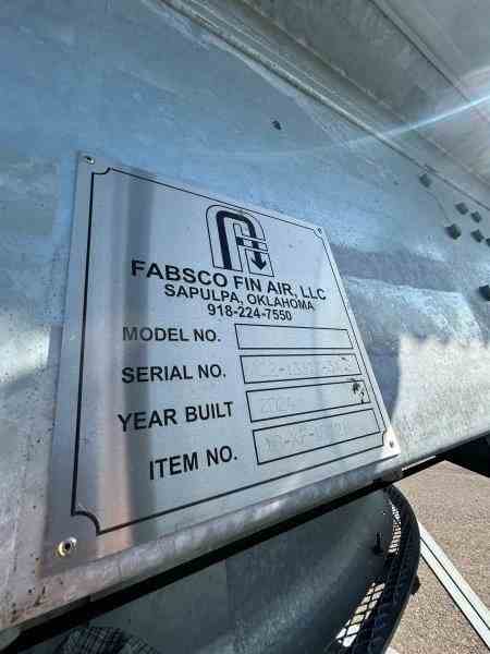 Unused Carbon Steel 33614 sq ft (1589 bare sq ft) fin fan heat exchanger. Manufactured by Fabsco. 26.64 MMBTU/hr design duty. Rated 50psi/FV @350F. 24'0" tube length. (2) 10HP fans. 253-1"od x .095"mw. (2)8" inlets and (2)3" outlets. Dimensions: 34'10" l x 14'8" w x 10'10" h (with platforms) 11'9" w (w/o platforms), 38,288 lbs weight. Designed as Flash Steam Condenser. Under Nitrogen Purge. Built 2023.