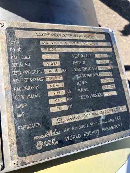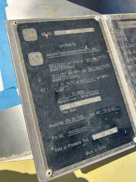 Unused 365 gallon 2507 Duplex SS Vertical Pressure Vessel. Manufactured by Jianglian Heavy Industrial Group (China). Rated 204PSI/FV@385F. Dish top and bottom. Leg mounted. 3'ID x 6'9"T/T. National Board #83. Serial #22-005R. Built 2023