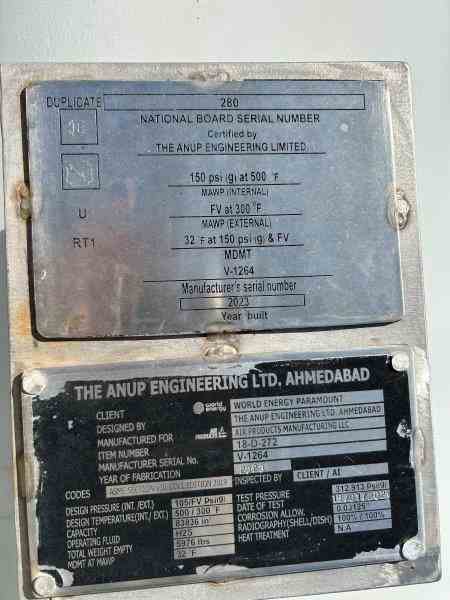 Unused 365 gallon 316 Stainless Steel vertical pressure vessel. Manufactured by Anup Engineering Ltd. Internal Design rated 150PSI/FV@500F. 2'6"ID x 10'T/T. Dished bottom head. Top head flanged flat. Skirt mounted. Built 2023.