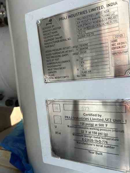 Unused 1017 gallon Carbon Steel vertical pressure vessel. Manufactured by Praj (India). Internal rated 18PSI @500F. 4'0"ID x 9'6"T/T. Dished head and bottom. Leg mounted. 6,306 lbs weight. Built 2023. NB #573, Serial #E23020-19-D-776. Designed as Plant Air Receiver For Bleaching Filters.