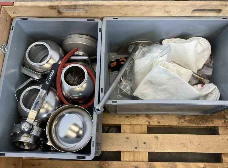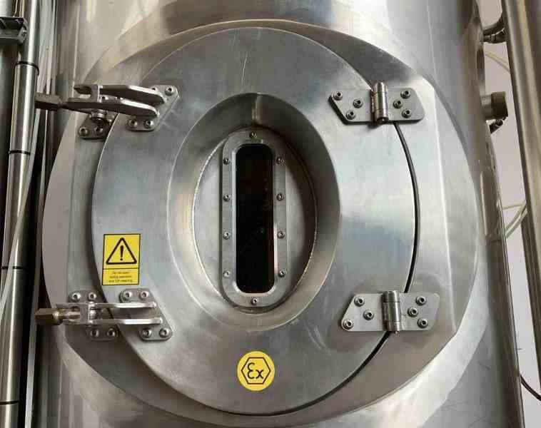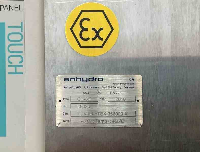 Used 35.4" Dia Stainless Steel Spray Dryer. Manufactured by Anhydro. Model CH-63 ATEX. 900 mm (35.4") dia drying tower with 39.4" cylindrical height and 23.6" conical height. Outlet diameter 100 mm (3.9"). Evaporation capacity up to 13 kg/hr (water). Air heating via 15 kW electric system. Fan motor 0.7 kW, 400V, with an additional 1.1 kW motor. Atomization available via both rotary atomiser (63 mm) and nozzle atomiser options. Includes drying tower mounted on frame, cyclone separator (Ø 200 × 600 mm / 7.9" × 23.6"), dust filter with air-pulse cleaning, and fan system. With switchgear and CE certification. explosion panel with flame arrestor, includes 15 litre liquid dosing vessel, siemens S7 control panel plc and HMI. Floor footprint 2.5 × 2.2 m. Built 2010.