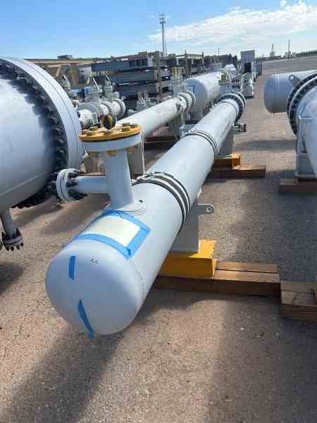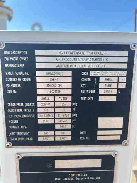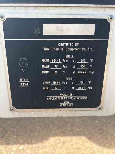Unused 569 sq. ft. Carbon Steel horizontal heat exchanger. Mfg. by Wuxi Chemical Equipment in 2023. 1.625 Design duty (MMBTU/Hr). Shell Design Rating: 200/FV psig @ 300 deg. F. Tube Design Rating: 155 psig @ 300 deg. F. Shell mawp 654.4/FV psig @ 300 deg. F. Tube mawp 556.91/FV psig @ 300 deg. F. 5.25" X 210". Serial # WHA22-165-1; National Board #549. HGU condensate trim cooler (for HGU feed). Under Nitrogen Purge.