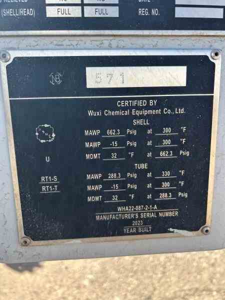 Unused 333 sq. ft. Duplex 2205 SS horizontal heat exchanger. 7.9 Design duty (MMBTU/Hr). Mfg. by Wuxi Chemical Equipment (China) in 2023. Shell Design Rating: 370/FV psig @ 300 deg. F. Tube Design Rating: 285/FV psig @ 330 deg. F. Shell mawp 662.3/FV psig @300 deg. F. Tube mawp 288.3/FV psig @ 330 deg. F. 5.5" X 16'7.5". Serial # WHA22-087-2-1-A. National Board #571. Feed/Effluent exchanger. Under Nitrogen Purged.