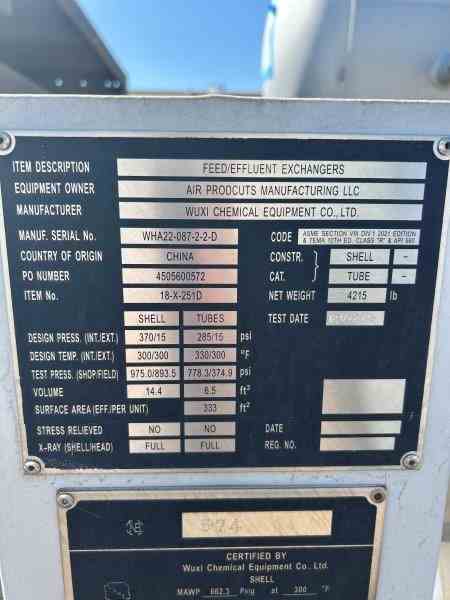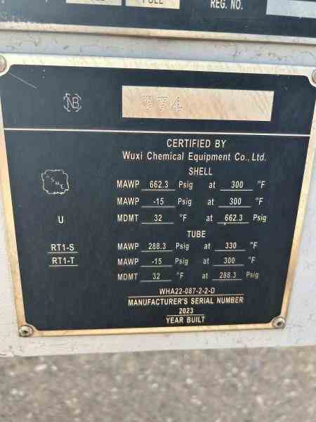 Unused 333 sq. ft. Duplex 2205 SS horizontal heat exchanger. 7.9 Design duty (MMBTU/Hr). Mfg. by Wuxi Chemical Equipment (China) in 2023. Shell Design Rating: 370/FV psig @ 300 deg. F. Tube Design Rating: 285/FV psig @ 330 deg. F. Shell mawp 662.3/FV psig @ 300 deg. F. Tube mawp 288.3/FV @ 330 deg. F. 15.5" X 16'7.5". Serial# WHA22-087-2-2-D. National Board #574. Feed/Effluent exchanger. Under Nitrogen Purged.