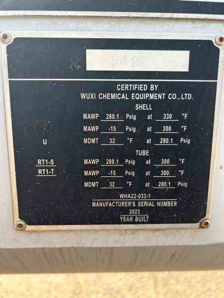 Unused 4142 sq. ft. 316L Stainless steel heat exchanger. Mfg. by Wuxi Chemical Equipment. 23 Design duty (MMBTU/Hr). 316L SS Shell Design Rating: 150/FV psig @ 330 deg. F. 316L SS Cladded Tube Design Rating: 195/FV psig @ 300 deg. F. Shell mawp 280.1/FV psig @ 330 deg. F. Tube mawp 280.1//fV psig @ 300 deg. F. 44" X 198". Serial #WHA22-033-1 National Board #542. Built 2023. Lean/Rich Amine Exchanger. Under Nitrogen Purged.