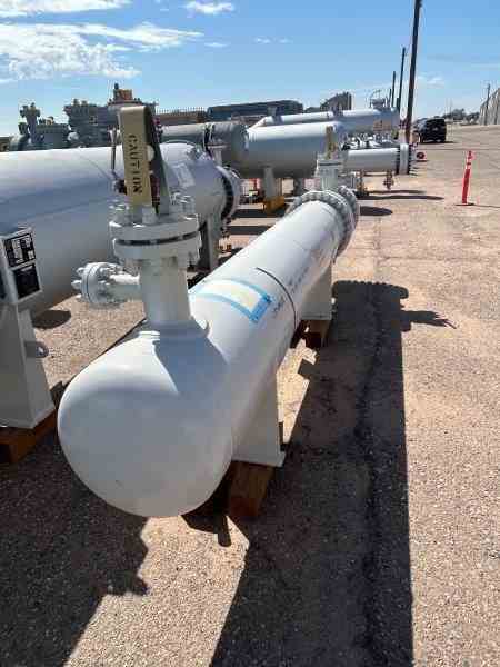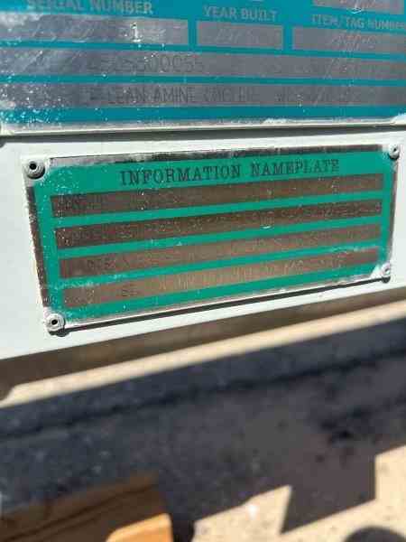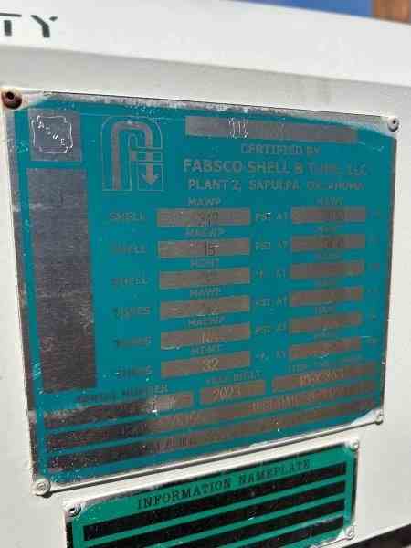 Unused 521 sq. ft. CS heat exchanger. Mfg. by Fabsco Shell and Tube. 1.75 Design duty (MMBTU/Hr). Shell: 270FV psi @ 300 deg. F. Tubes: 210 psi @ 150 deg. F. 21.25" X 120". TAG 18-X-263. Built 2023. LP Lean Amine Cooler. Under Nitrogen Purged.