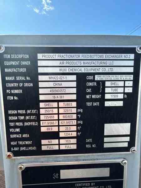 Unused 1234 sq. ft. Carbon steel heat exchanger. Mfg. by Wuxi chemical Equipment in 2023. 7.6 Design duty (MMBTU/Hr). Shell Design Rating: 250/FV psig @ 725 deg. F. Tube Design Rating: 325/FV psig @ 680 deg. F. Shell mawp 380.1/FV psig @ 725 deg. F. Tube mawp 475.8/FV psig @ 680 deg. F. 30" X 144". Serial # WHA22-021-1. National Board #539. Product Fractionator Feed/Bottoms Exchanger No. 2. Under Nitrogen Purge