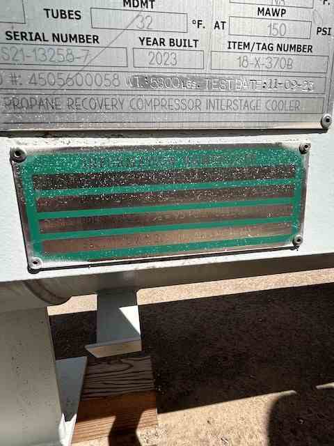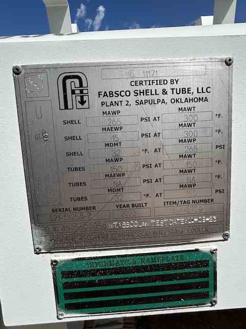 Unused 284 sq. ft. Duplex 2205 SS Horizontal heat exchanger. Mfg by Fabsco Shell and Tube. 2.32 Design duty (MMBTU/Hr). Shell Design Rating: 95/FV psi @ 300 deg. F. Tube Design Rating: 120 psi @ 150 deg. F. Shell mawp 265FV @ 300 deg. F. Duplex 2205 Stainless steel Tube mawp 150 psi @ 150 deg. F. 21" X 168". Serial #S21-132586-7. National Board #11171. Built 2023. Propane Recovery Compressor Interstage Cooler. Under Nitrogen Purge.