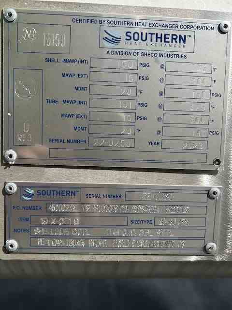 Unused 327 sq. ft. 316L Stainless steel horizontal heat exchanger. 1.13 Design duty (MMBTU/Hr). Mfg. by Southern Heat Exchanger. CS Shell: 150FV psi @ 375 deg. F. 316L Stainless steel Tubes: 161 psi @ 375 deg. F. 20" X 180". Serial # 22-0250. National Board #16150. Built 2023. Aerobic Reactor Heat Exchanger. Under Nitrogen Purge