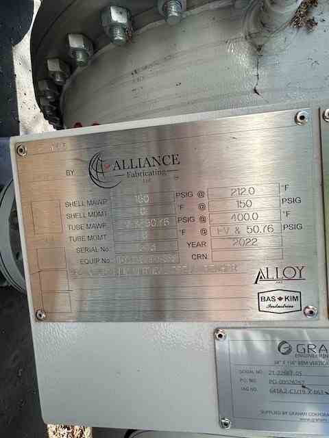 Unused Stainless Steel 2685 sq. ft. vertical shell and tube heat exchanger. 7.5 Design duty (MMBTU/Hr). Manufactured by Alliance Fab (Graham) in 2022. CS Shell Rated 150 psi @212F. 304SS Tubes rated 50FV psi @ 400F. Dimensions: 34" x 156".