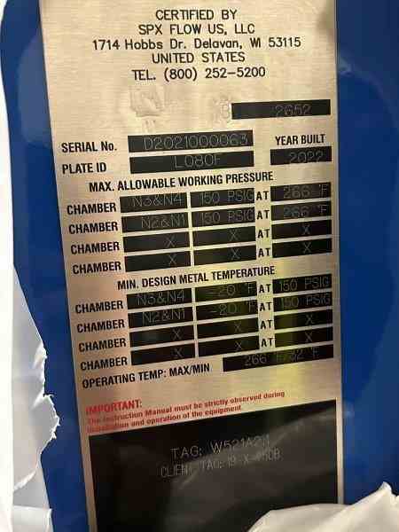 Unused 343 sq. ft. Titanium GR1 Plate & Frame heat exchanger. Manufactured by APV (SPX Flow). 4.85 Design duty (MMBTU/Hr). Rated 150 psi @ 266°F. Serial #D2021000063, NB #2652. Built 2022. Designed as Oil/Oil Heat Exchanger. Under Nitrogen Purge.