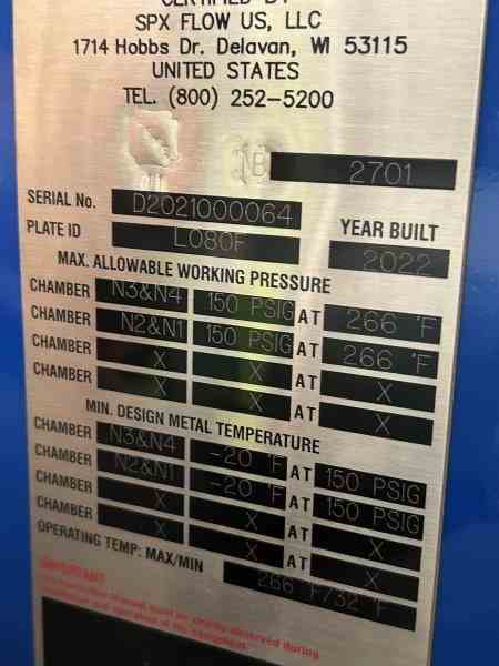 Unused 562 sq. ft. Titanium GR1 vertical plate & frame heat exchanger (4.85 MMBTU/Hr). Manufactured by APV in 2023, rated 150 psi @ 266 °F, designed as oil/oil HX. Under Nitrogen Purge. Serial #D2021000064; NB #2701.