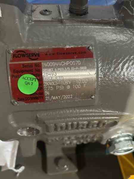 Unused 464 GPM 316 Stainless Steel Centrifugal pump. Manufactured by Flowserve. Model #2K4x3-10RV. 464 gpm @ 158' head. 250 deg. F. Casing: 316SS. Impeller: 316SS. 50 HP motor. Oil Dryer Discharge Pump.