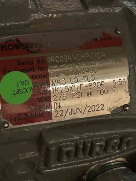 Unused 17 GPM 316 Stainless Steel Vacuum Pump. Manufactured by Flowserve. Model MARK 3 LO-FLO/1K1.5X1LF-82OP. 17 gpm @ 151' head. 248 deg. F. Casing: 316SS. Impeller: 316SS. 5 HP motor. Designed as Seal Tank Circulation pump.
