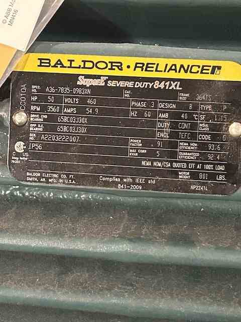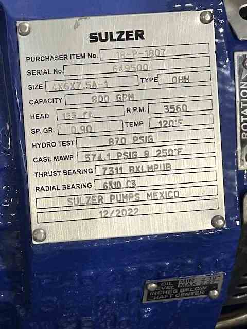 Unused 50 HP 316 Stainless Steel Centrifugal Pump. T-125001 Recirculating Pump. Mfg. Sulzer. Size 4x6x7.5A-1. 800 gpm @ 65' head. 574 psi @ 250 deg. F. Casing 316SS; Impeller 316SS. API Class: A-8. With 50 hp motor. Serial #649500.