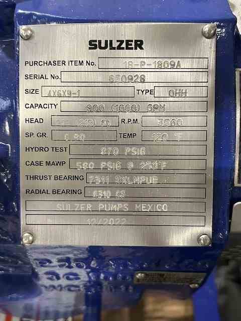 Unused 1000 GPM Centrifugal Pump. Raw Feed Transfer Pump. Mfg Sulzer. Size 4x6x9-1. 1000 gpm @ 219' head. 580 psi @ 250 deg. F. Casing 316SS; Impeller 316SS. API Class: A-8. With 100 hp motor