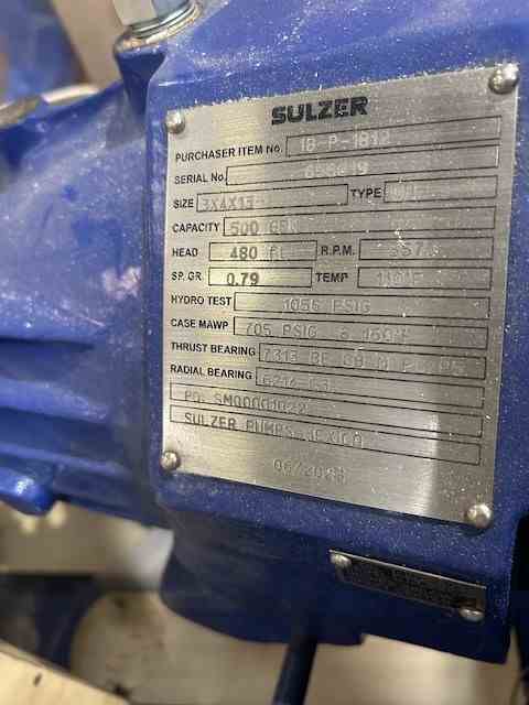 Unused 500 gpm Horizontal Centrifugal Pump. Mfg. by Sulzer. Size 3x4x13-1. 500 gpm @ 480' head. 705 psi @ 160 deg. F. Casing CS. Impeller 12 Cr. With 100 hp motor. Serial #656619. RJFU-B Startup Oil Pump.