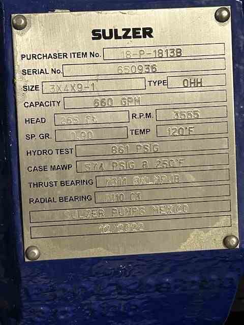 Unused 660 GPM Centrifugal Pump - 316 Stainless Steel. Manufactured by Sulzer. Size 3x4x9-1. 660 gpm @ 265' head. 574 psi @ 250 deg. F. Casing 316SS. Impeller 316SS. API Class A-8. With 75 hp motor. Serial #650936. Feed Transfer Pump.