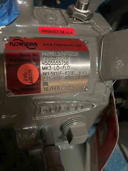 Unused Horizontal Centrifugal Pump. 50% Citric Acid Transfer Pump. Mfg. by Flowserve. Size 1K1.5x1LF-820P.17 gpm @ 50' head. 267 psi @ 120 deg. F. 316LSS. With 5 hp motor