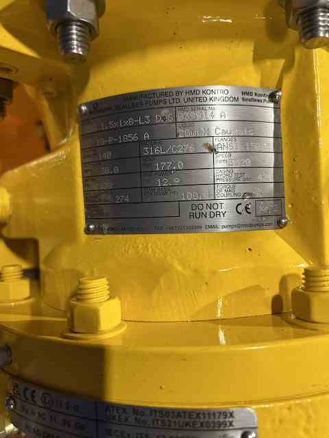 Unused 30 GPM Stainless Steel Centrifugal Pump. Mfg. by Sundyne Kontro. Size GSA1.5x1x8-L3 DA6. 30 gpm @ 177' head. 256 psi @ 150 deg. F. Casing 316LSS. Impeller 316SS. With 20 hp motor. Serial #839914A. Caustic Distribution Pump.