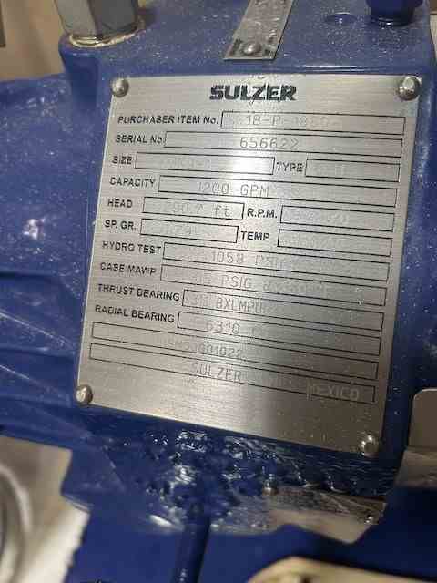 Unused 125HP Centrifugal Pump. Mfg. by Sulzer. Size 4x6x9-1. 1200 gpm @ 290.7' head. 705 psi @ 160 deg. F. Casing CS. Impeller 12 Cr. With 125 hp motor. Serial #656622. Diesel Product Loading Pump.