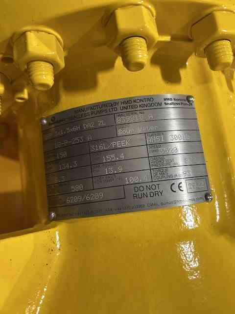 Unused 20 HP Magnetic Driven Single Stage Centrifugal Pump. Mfg. by Sundyne HMD Kontro. 134.3 gpm @ 155.4 head. 580 psi @ 150 deg. F. Casing 316L SS. Impeller 316L SS. With 20 hp motor. Serial #839918A. Transfer Pump.