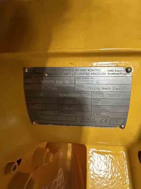 Unused 15 HP 316L Stainless Steel Magnetic Driven Single Stage Centrifugal Pump. Mfg. by Sundyne HMD Kontro. 20.5 gpm @ 253.4 head. 580 psi @ 170 deg. F. Casing 316L SS. Impeller 316L SS. With 15 hp motor. Serial #839919A. Caustic Circulation Pump.