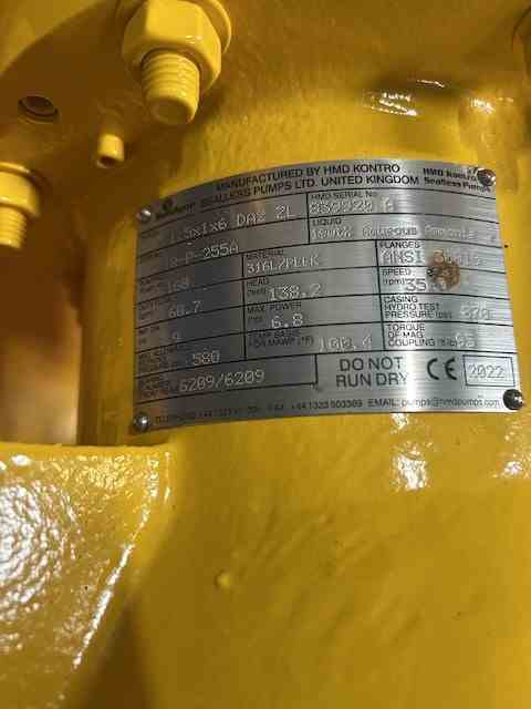 Unused 7.5 HP Magnetic Driven Single Stage Centrifugal Pump. Mfg. by Sundyne HMD Kontro. 60.7 gpm @ 138.2 head. 580 psi @ 160 deg. F. Casing 316L SS. Impeller 316L SS. With 7.5 hp motor. Serial # 839920A. Aqua Ammonia Pump.