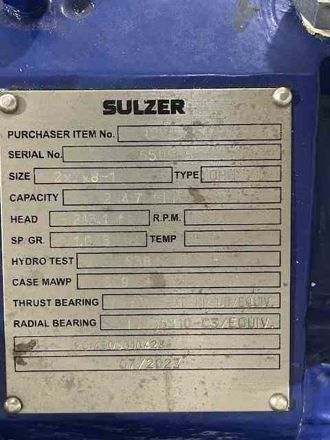 Unused 40 HP Centrifugal Pump. Mfg. by Sulzer. Size 3x2x8. 254.7 gpm @ 213 head. 559 psi @ 300 deg. F. Casing 316L. Impeller 316 SS. With 40 hp motor. Serial # 650955. LP Absorber Rich Amine Pump.