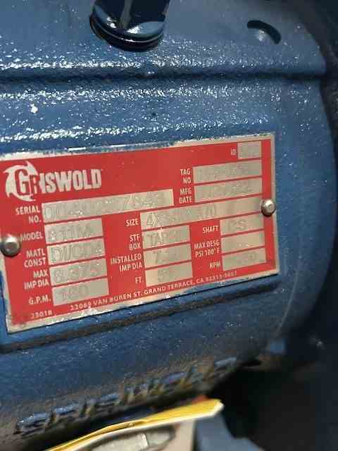 Unused 180gpm Centrifugal Sludge Recycle Pump. Mfr Griswold. 180 gpm @ 51' head. Casing: Ductile Iron. Impeller: Duplex SS. 5 HP motor. S/N 0040227843.