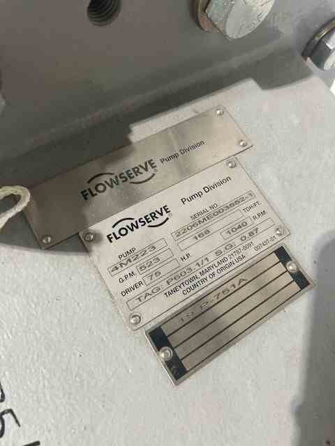 Unused 75hp Alloy 600 PE Maturator Feed Pump. Manufactured by Durco (Flowserve). Model 4M223. 523 gpm @ 168' head. 306 deg. F. Casing: HC600. Impeller: HC600. 75 HP motor. Serial #2206ME003552-1.