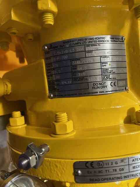Unused 5 gpm 316L SS Horizontal Centrifugal Magnetic Drive Pump. Mfg. by Sundyne HMD Kontro. Model GSA-1.5X1X8-L3. ASME B 73.3. 44' head. 231 psi @ 228°F. Casing: 316LSS. Impeller: 316LSS. 7.5 HP motor. Serial #839915. Designed as Vent Gas KO Drum Pump.
