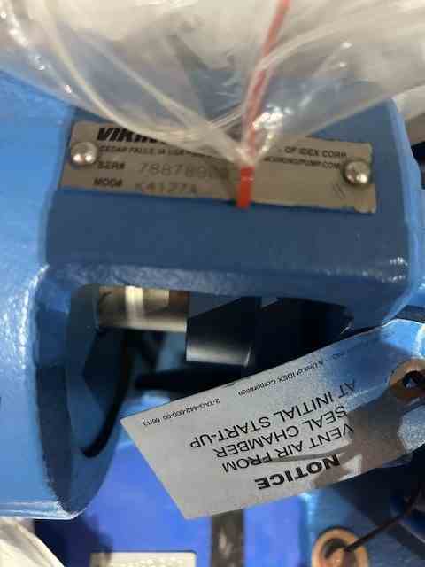 Unused 23 GPM 316 Stainless Steel Horizontal Gear Pump. Waste Oil Pump. Mfg. by Viking. Model K4127A. 23 gpm @ 36 psi. 1.5 hp, 1750 rpm, 208-230/460 volts. Nord gearbox, Gearbox input 1760 rpm,.Gearbox output 337 rpm. Gear ratio 4.93. 2" suction, 2" discharge. Serial# 7887890032