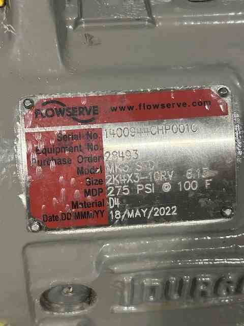 Unused 466 gpm 316SS Horizontal Centrifugal Pump. Mfg. by Durco (Flowserve). Model: Mark III. 245' head. Size 2K4x3-10RV-8.13. Type MK3 STD. MDP 275 psi @ 100°F. 248°F. Casing: 316SS. Impeller: 316SS. 60 HP motor. Serial #1400944CHP001C. Designed as Acid Reactor Discharge Pump.