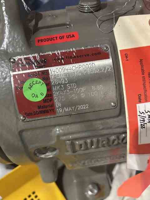 Unused 446 gpm 316SS Horizontal Centrifugal Pump. Mfg. by Durco (Flowserve). Model Mark III. 273' head. Size 2K4x3-100P-8.88. Type MK3 STD. MDP 275 psi @ 100°F. 250°F. Casing: 316SS. Impeller: 316SS. 60 HP motor. Serial #1400944CHP002D. Designed as Degummed Oil Surge Tank Discharge Pump.