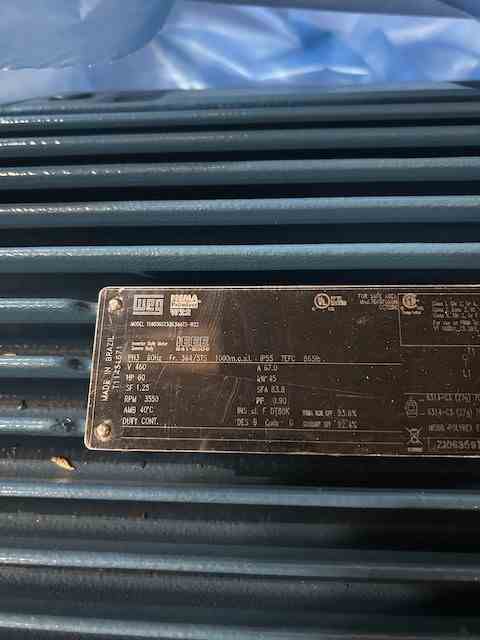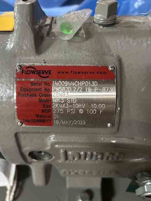 Unused 447 gpm 316 SS Horizontal Centrifugal Pump. Mfg. by Durco (Flowserve). Model Mark III. @ 190' head. Size 2K4x3-10RV-10.00. Type MK3 STD. MDP 275 psi @ 100°F. 248°F. Casing: 316SS. Impeller: 316SS. 60 HP motor. Serial #1400944CHP013D. Designed as Oil Collecting Tank Discharge Pump.