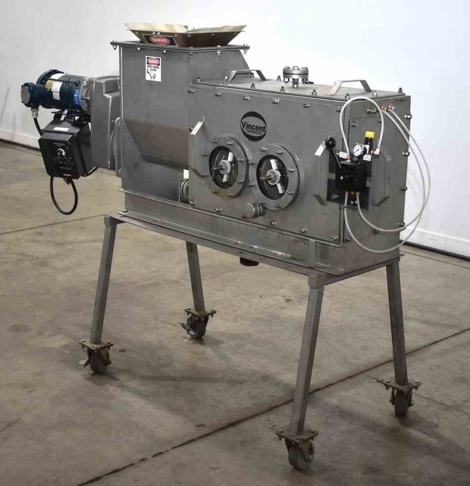 Used Vincent Model CP-4-VT Stainless Steel Screw Press. Vapor Tight. 110 lbs per hour. 98% Oleoresin recovery and 75-80% ethanol recovery. 4" Diameter screw with (4) stages of compression features interrupted, reducing pitch flights. Lesson 1.5 HP Motor. Model # 145T17XK6A with Nord Drive Systems Gear Box. Ratio 88.74 to 1. Model # 3282AFBVLN140TC. KC Genesis AC Motor Speed Control. Model # KBAC-27D (3G) (GRY) (9520T). Food grade ready on all contact components Explosion proof motor. Mounted on stand with (4) casters.