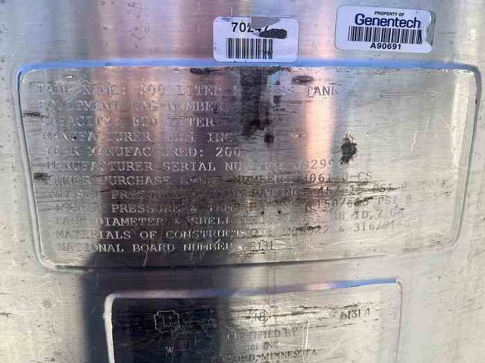 Used 158 Gallon Hastelloy Reactor Vessel. Manufactured by DCI. 600 liter. MAWP 45 PSI /FV @ 350F. Jacket rated 150 PSI @ 365F. Hastelloy C-22 construction. Multiple top inlets, clamps and probes, dished bottom. Forklift ready, mobile on casters. National Board #G131. Serial #JS2996. Built 2005. Previously used in biotech operation.