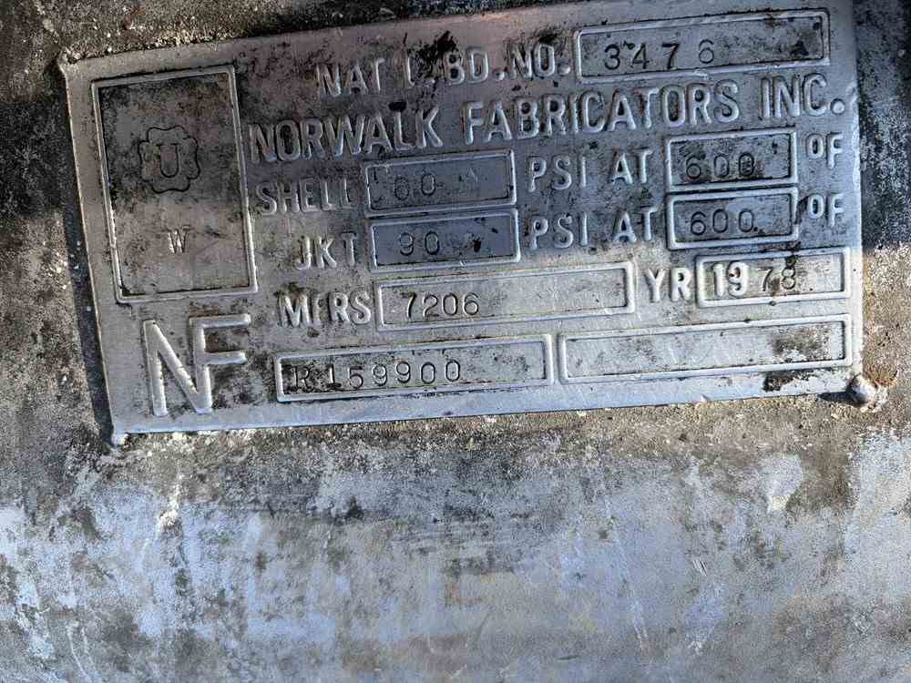 Used approximately 3000 gallon T316 stainless steel half pipe coil jacketed reactor. Built by Norwalk Fab. Internal rated 60 psi @ 600 F. Jacket rated 90 psi @ 600 F. Dished top and bottom heads. Half pipe coil jacket. 25 Hp Motor and Gearbox with Center mounted top drive with 4 blade pitched turbine agitator. 2 Baffles. Center bottom outlet. On legs. National Board #3476. Serial #7206. Built 1978
