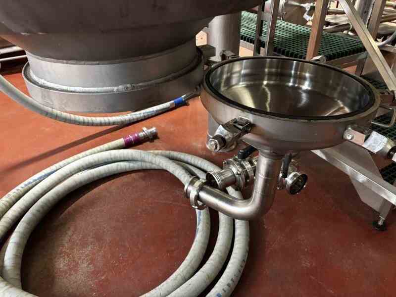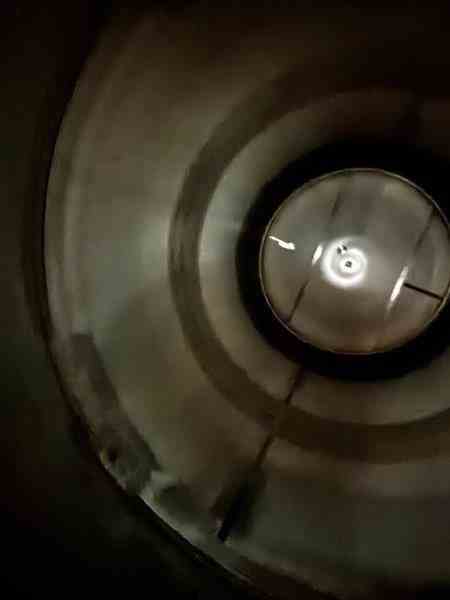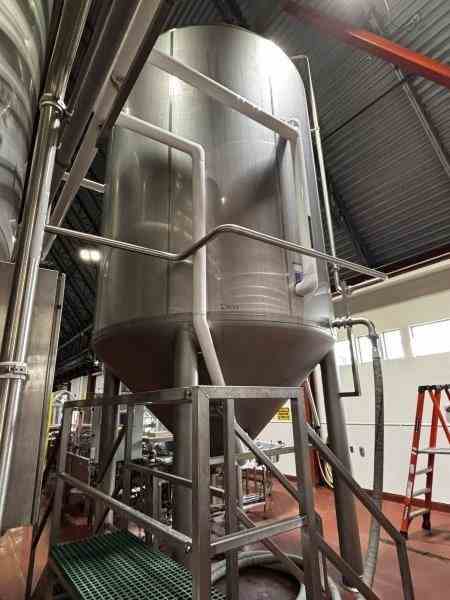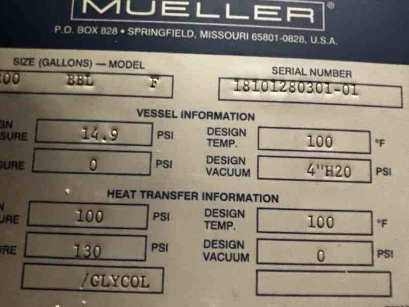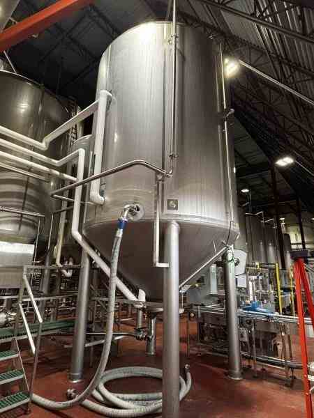 Used 8300 gallon 304 Stainless Steel tank, jacketed, cone bottom. Manufactured by Mueller. Model F. Internal 14.9PSI@100F. Cooling Jacket 100PSI@100F. 143"T/T x 117"ID. 267" OAH. Dome top. 16" Bottom cone manway with 3" CBO. (4) Leg mounted. Built 2010. 200 BBL brewery fermentation vessel.