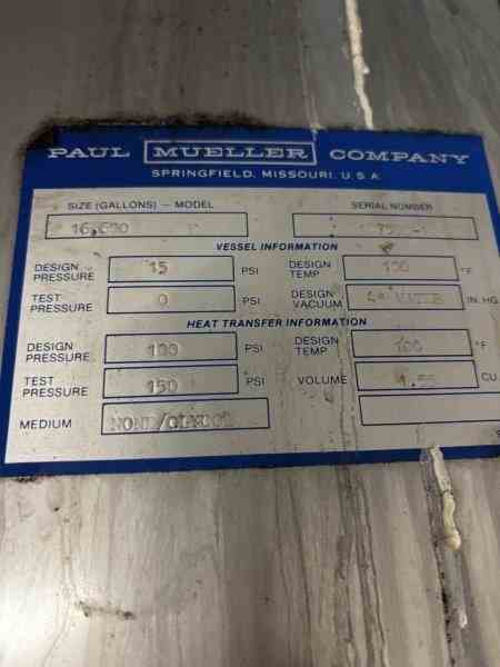 Used 16600 Gallon 304 Stainless Steel tank, jacketed, cone bottom. Manufactured by Mueller. Dished head. 10' 1 7/8" OD x 36' 11 3/8" Tall. Shell rated 15 psi @100F. Jacket rated 100 psi @100F. Weight 13200 lbs. Serial #167598-1. Previous use: 400 BBL Brewery Brite Tank.