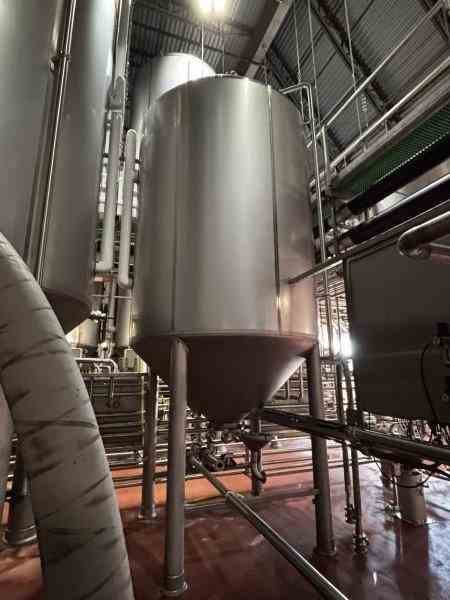 Used 4150 gallon 304 Stainless Steel, jacketed, cone bottom vessel. Manufactured by Mueller. Internal 15 PSI@100F. Dome top. 97 7/16" OD x 219" (4) Leg mounted. Serial #164585-3. Previous use: 150 BBL Brewery Fermentation Vessel.